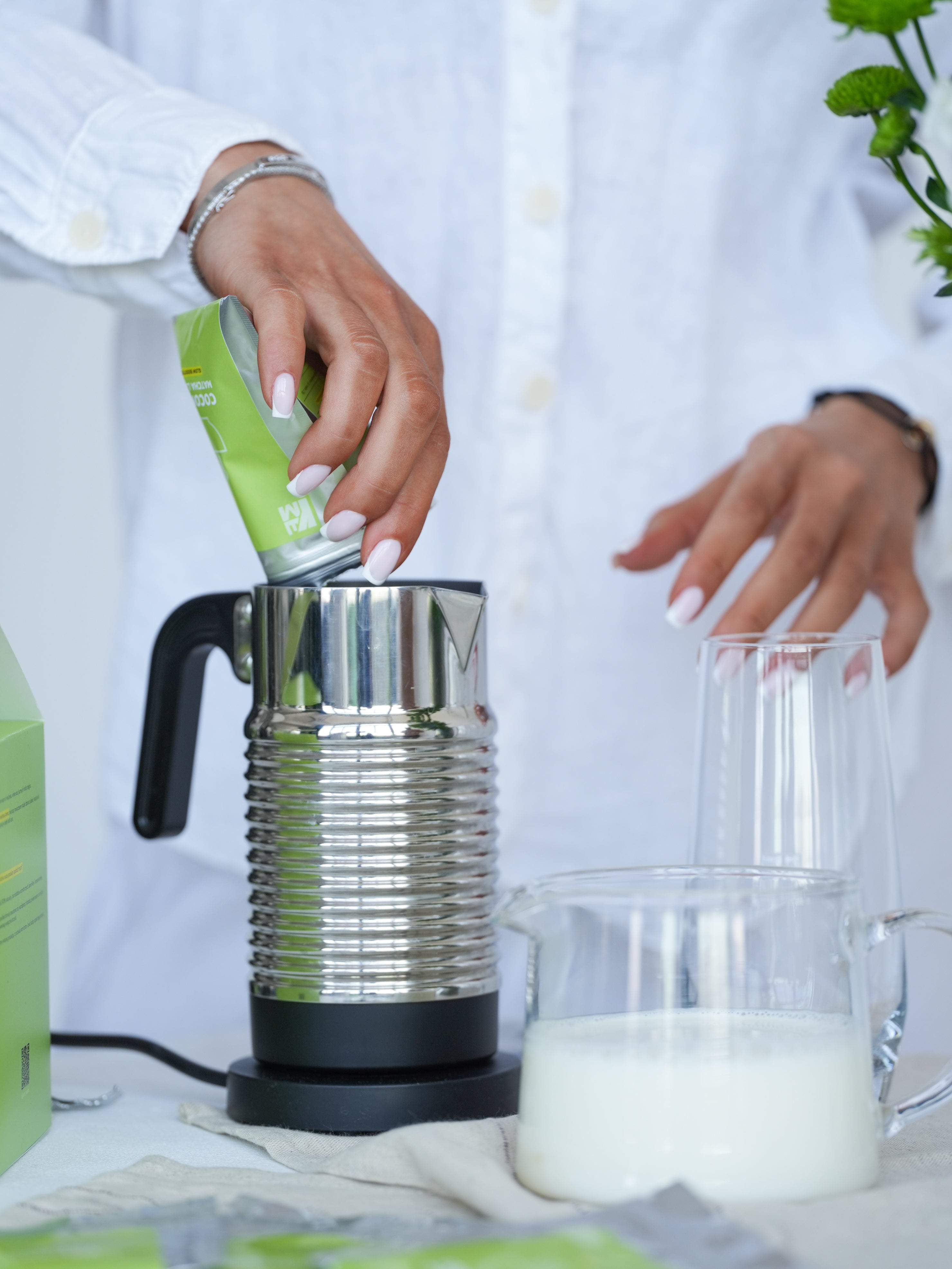 Śmiało wsyp zawartość saszetki do spieniacza do mleka i voila!